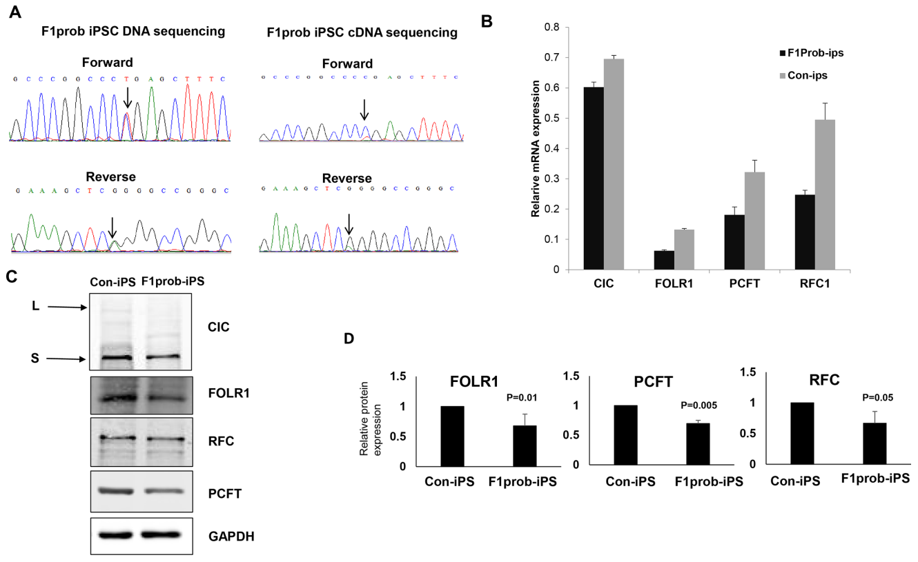 Рисунок 5. Экспрессия гена CIC в иПСК пробанда 1-й семьи и регулирующее воздействие гена на экспрессию транспортеров фолата. (A) Секвенирование ДНК иПСК-клеток пробанда из 1-й семьи (F1prob) и хроматограмма секвенирования кДНК указывают на сниженный уровень мРНК мутантного CIC по сравнению с мРНК CIC дикого типа. (B) Анализ CIC, FOLR1, PCFT и RFC1 в иПСК пробанда из 1-й семьи и в контрольных иПСК методом qRT-PCR. (C) Иммуноблот-анализ экспрессии белка генов CIC, FOLR1, PCFT, RFC1 в иПСК пробанда 1-й семьи (F1prob) и в контрольных иПСК. (D) Количественная оценка результатов иммуноблот-анализа с помощью программы ImageJ с использованием уровня белка GAPDH в качестве эталона.