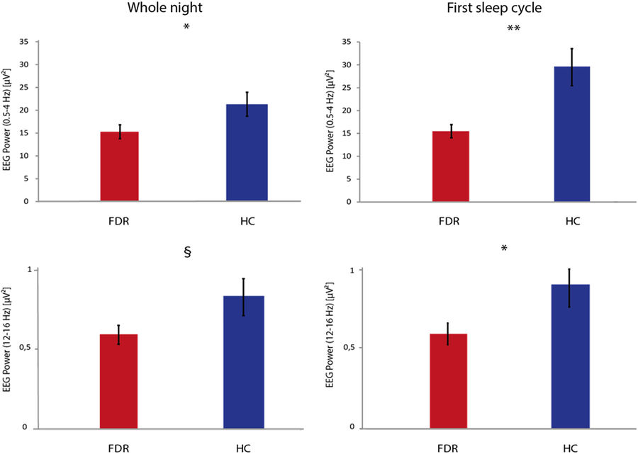 Спектральная мощность ЭЭГ-сигнала у родственников пациентов с шизофренией (FDR) и здоровых испытуемых из контрольной группы (HC). Верхний ряд: спектральная мощность в дельта-диапазоне, вычисленная для всего ночного периода (слева) и для первого цикла сна (справа). Нижний ряд: спектральная мощность в диапазоне сонных веретен (сигма-ритм), вычисленная для всего ночного периода (слева) и для первого цикла (справа).
