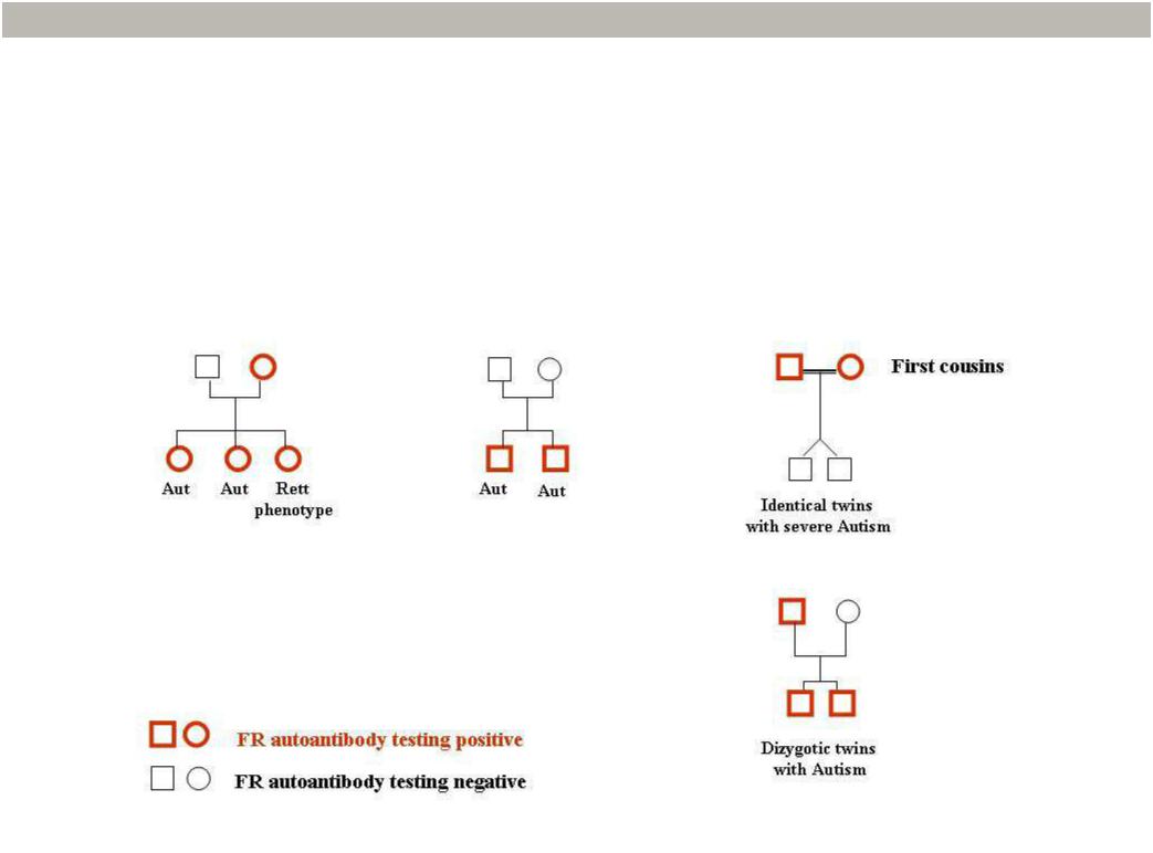 Турецкая семья с матерью-носителем блокирующих антител к FRa (вверху слева). Данная мать родила трех девочек, у каждой из которых были обнаружены антитела к FRa. У девочек был выявлен аутизм с низким IQ, а у младшей из дочерей также Ретт-подобный синдром. В другой семье (вверху посередине) антител не было обнаружено у родителей, а у их двоих сыновей был диагностирован тяжелый аутизм и выявлены аутоантитела к FRa. В тунисской семье (вверху справа) аутоантитела к FRa были обнаружены у обоих родителей, но при этом у их детей – монозиготных близнецов, страдавших тяжелой формой аутизма – анализ не выявил антител. Внизу справа - древо семьи, в которой у здорового отца с антителами к FRa родились сыновья-двойняшки с антителами, при этом у матери антитела отсутствовали.